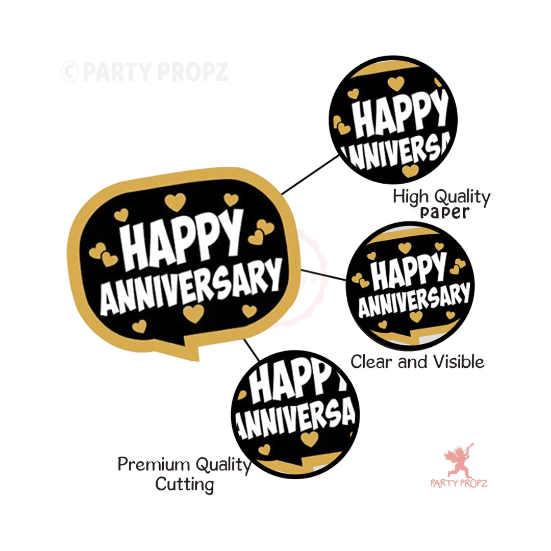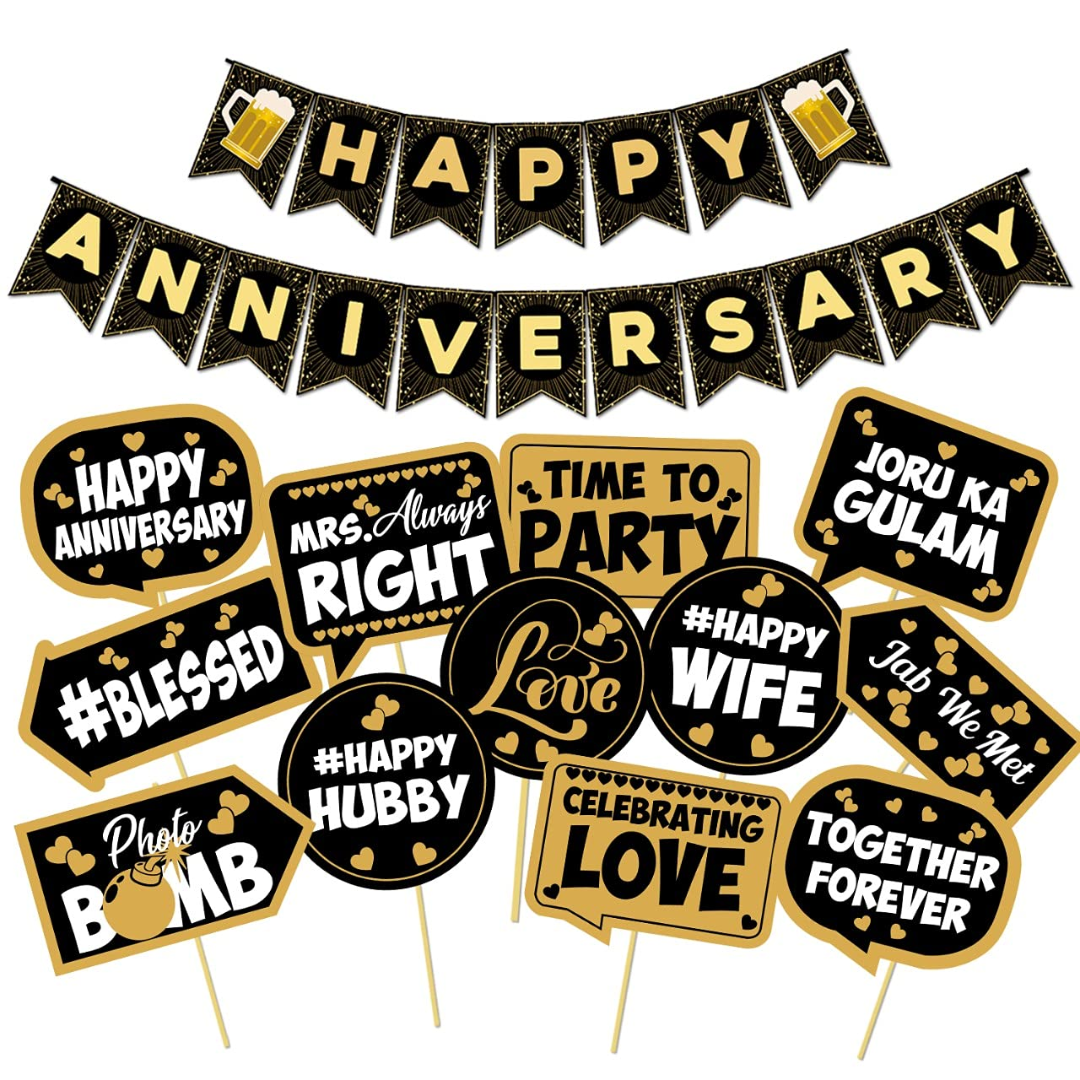 This happy aniversary combo set includes 1 Pc black and golden happy anniversary banner and 1 set of 12Pcs Photo booth props. Happy anniversary banner is made of cardstock and photobooth also is made of cardstock.