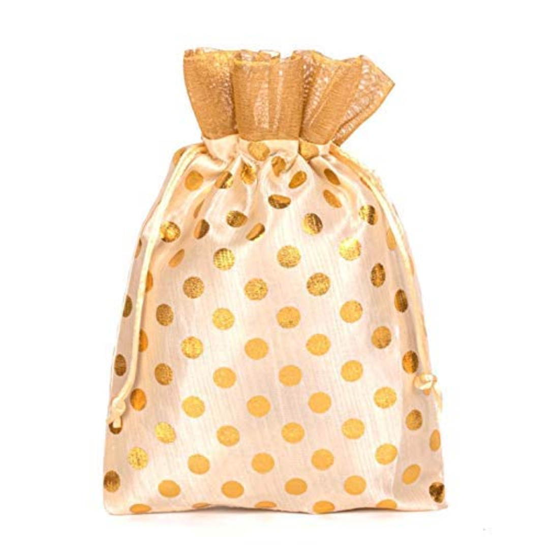 Thiese Potli bags meet the purpose of return gift on wedding, anniversay, birthday, baby shower and other occasions. it has capacity of 500 gms. this potli bags made from organza silk thread with drawstring clasp. These are Medium sized, elegant and trendy designer polka potli pouches suitable for keeping gift items and also for storing small items in order to avoid hassles searching for them. These pouches are designed using round golden dotted patterns which adds an exquisite and traditional look to this tiny beauty. Ease of accessibility – It can be closed and opened easily with minimum effort. Easily Portable – as it is small in size one can carry it without any trouble. Made in INDIA this trendy and stylish potli bags is ideal to put your valuables, accessories. This is a traditional and Potli bag which helps you carry things when at a wedding or party. The stunning Potli bag is perfect for everyday as well as for the party use. Its light in weight and has a great color. You can use this to distribute gifts to your friends, relatives and family members for Birthdays, Anniversary, Weddings or even as return gifts. These can also be used to store Dryfruit.
