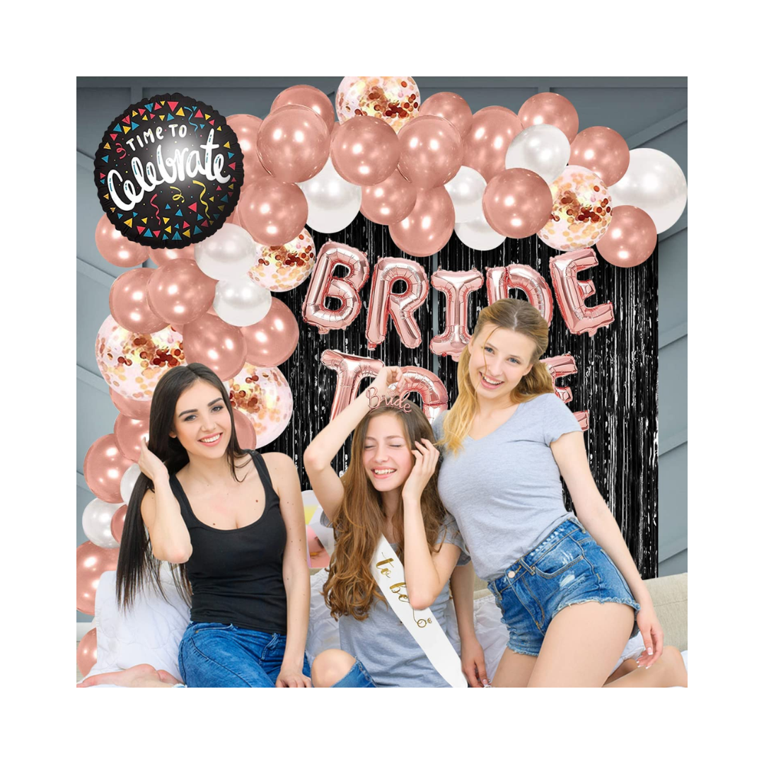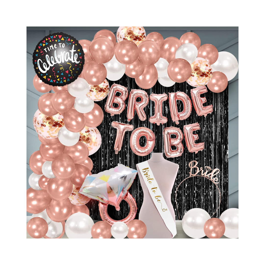 • COMPLETE BACHELORETTE PARTY DECOR COMBO: Elevate the excitement of the bride to be’s celebration with our Party Propz Bride to Be Decoration Set Combo which includes 1pc bride to be rose gold foil balloon, 1pc time to celebrate printed round foil balloon, 30pcs rose gold & white metallic balloons, 5pcs rose gold confetti, 1pc ring foil balloon, 2pcs black foil curtains, 1pc bride hairband, 1pc bride to be sash.