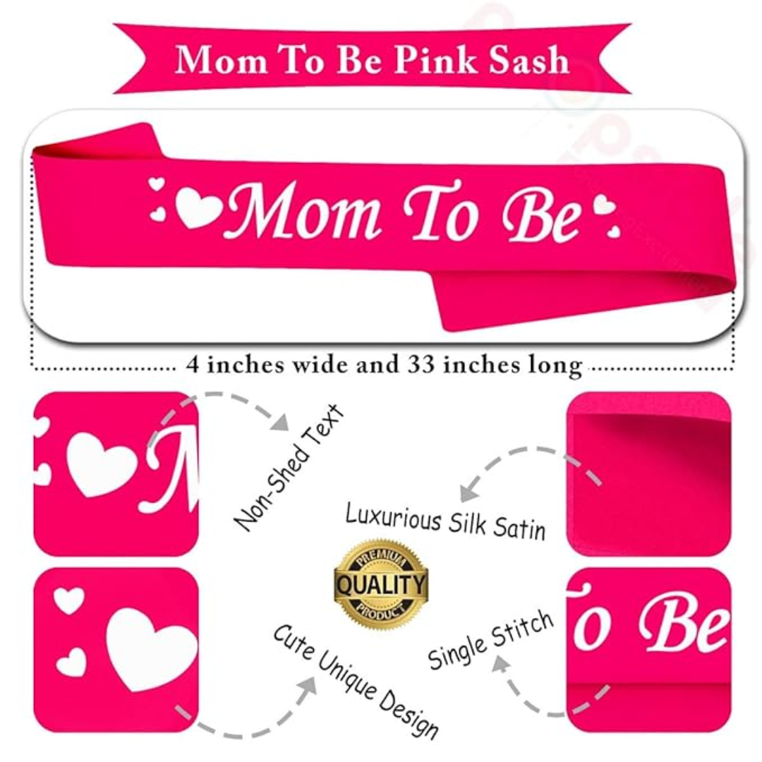 - The “Mom to Be” satin sash, in striking hot pink, symbolizes the vibrant and nurturing spirit of the expecting mother.