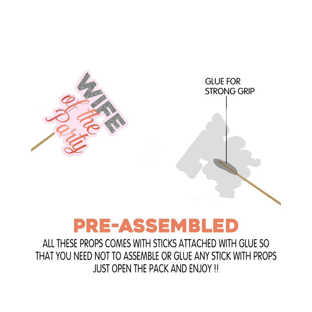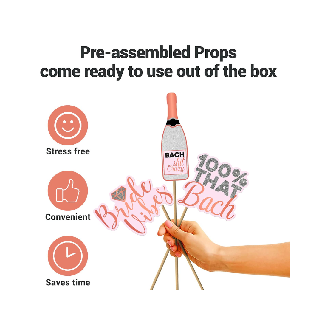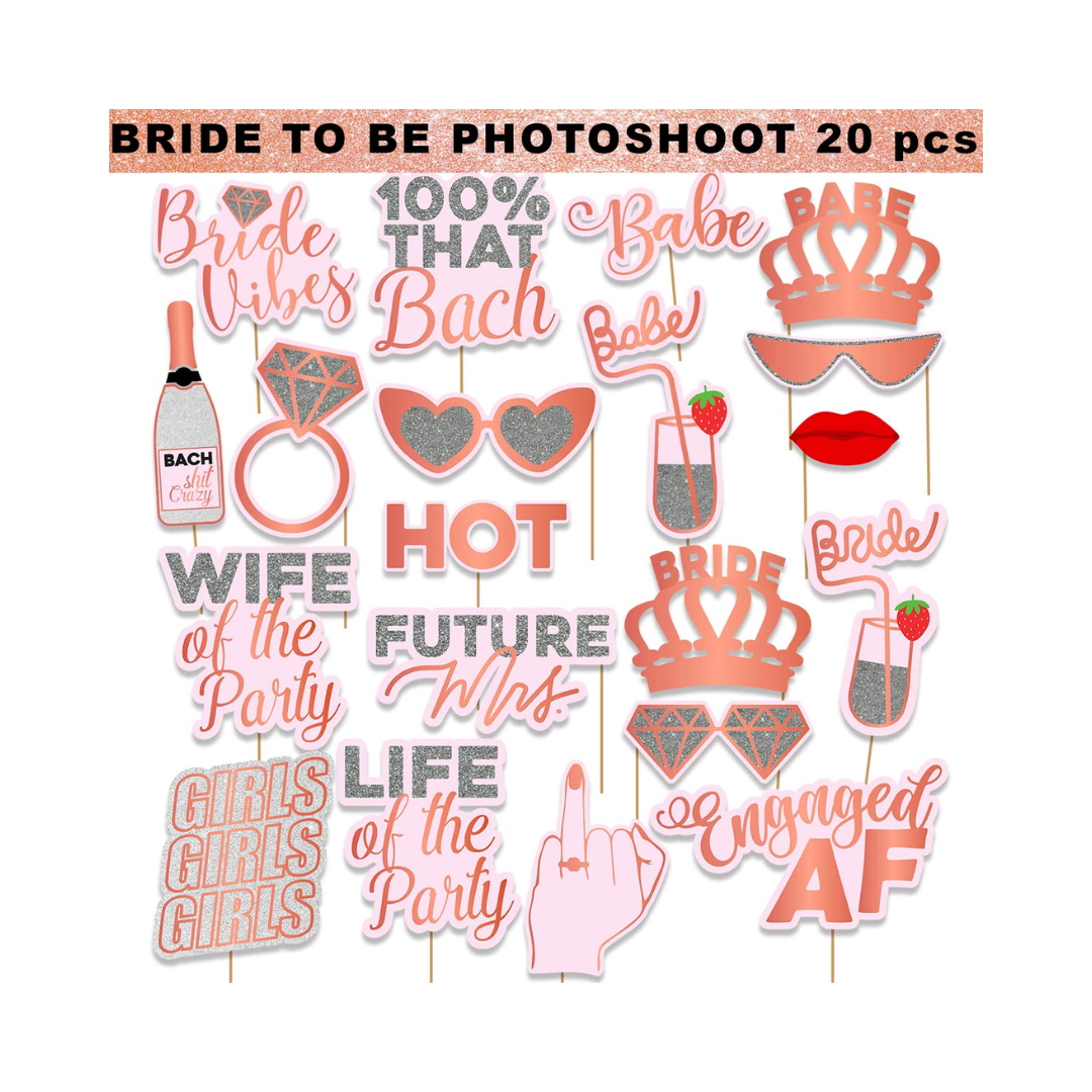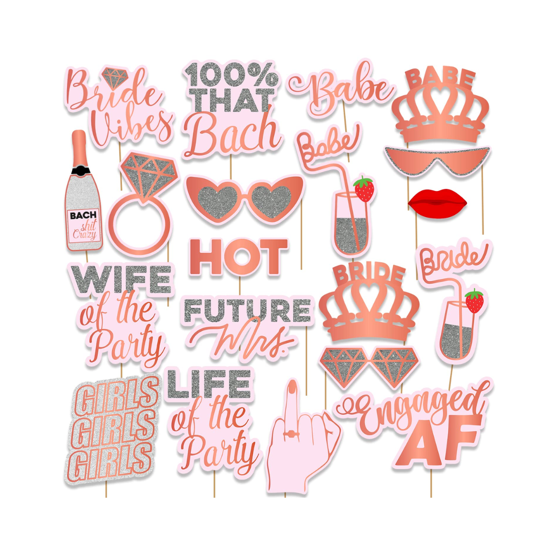 • For Your Future Mrs.: bring all the Bride Vibes to your party with these too-cute props featuring designs of diamond sonnies, sparkly bottles, sassy ring fingers, tiaras + more! Girls, Girls, Girls: no babe’s left behind with this set of props! With 20 uniquely designed pieces, everyone can come hang at your bachelor party’s photo booth area! :)That Bach: we decided to help you go from Miss to Mrs. with a BANG! This set of shiny and extra as heck photo booth props will be the talk of the night!