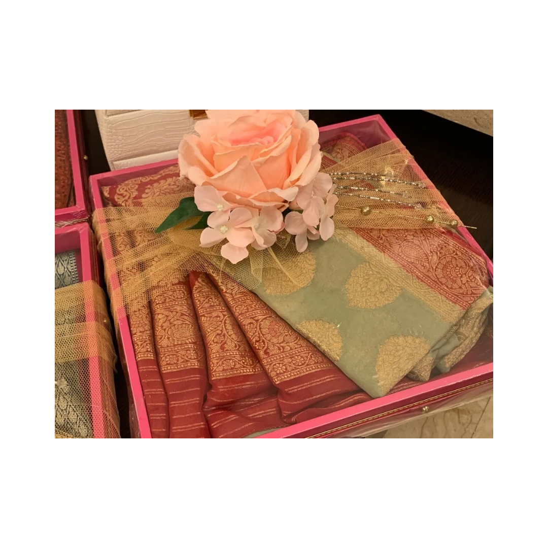 Introducing our ready-to-use gift, saree, and suit packing tray collection – the epitome of convenience and elegance in packaging solutions. Crafted with meticulous attention to detail and designed to impress, our trays offer a hassle-free way to present your cherished gifts with style and sophistication. Each tray in our collection is expertly crafted from high-quality materials, ensuring durability and reliability. Whether you’re gifting a saree, a suit, or any other special item, our trays provide the perfect foundation for showcasing your thoughtful gesture. With our ready-to-use trays, there’s no need to spend hours assembling packaging materials or worrying about presentation. Simply place your gift onto the tray, and you’re ready to go. Our trays come pre-decorated with exquisite embellishments, including flowers, ribbons, bows, and other decorative elements, adding a touch of luxury to your gift presentation. Whether you’re celebrating a wedding, a birthday, or any other special occasion, our ready-to-use gift, saree, and suit packing trays are sure to make a lasting impression. Experience the convenience and elegance of our packaging solutions today.
