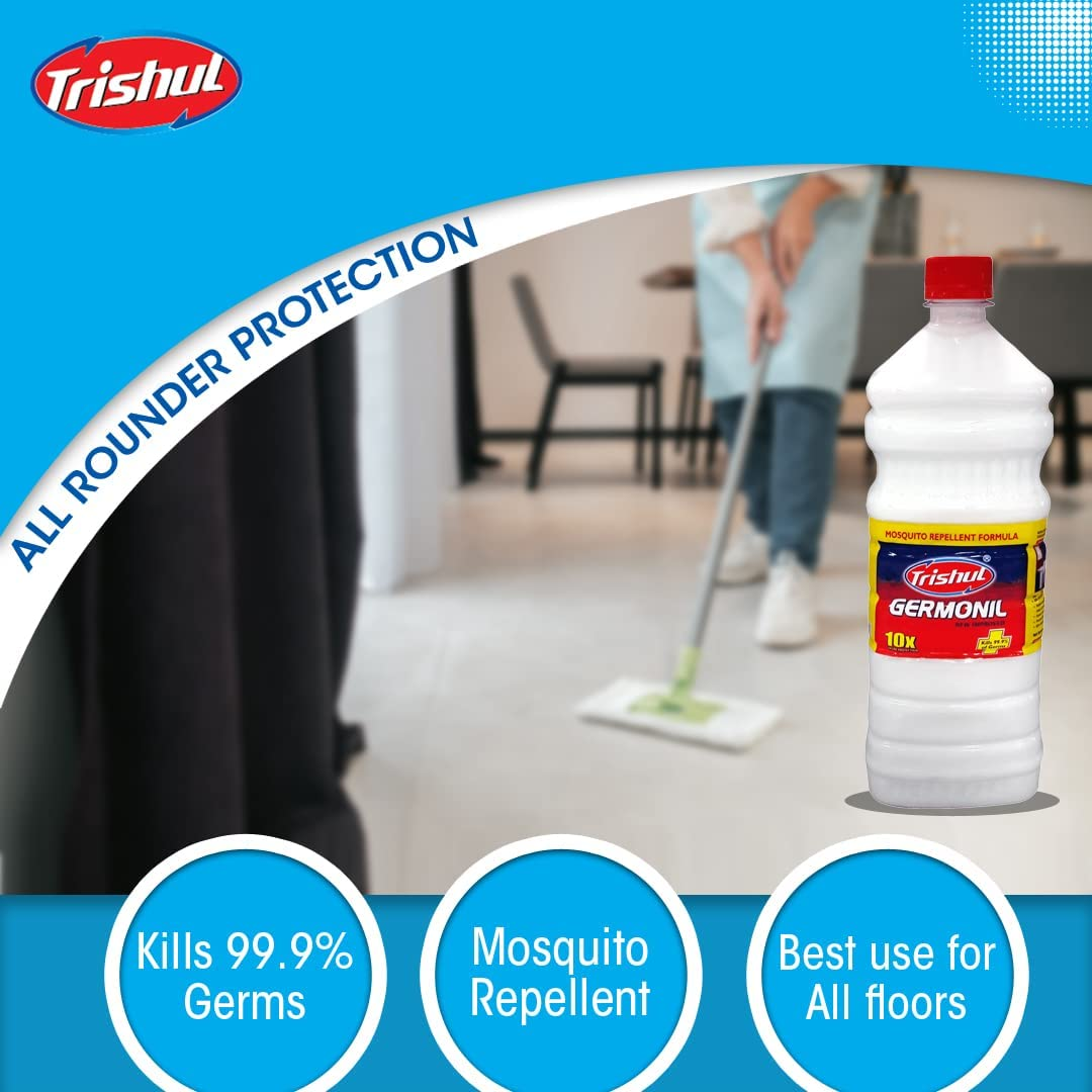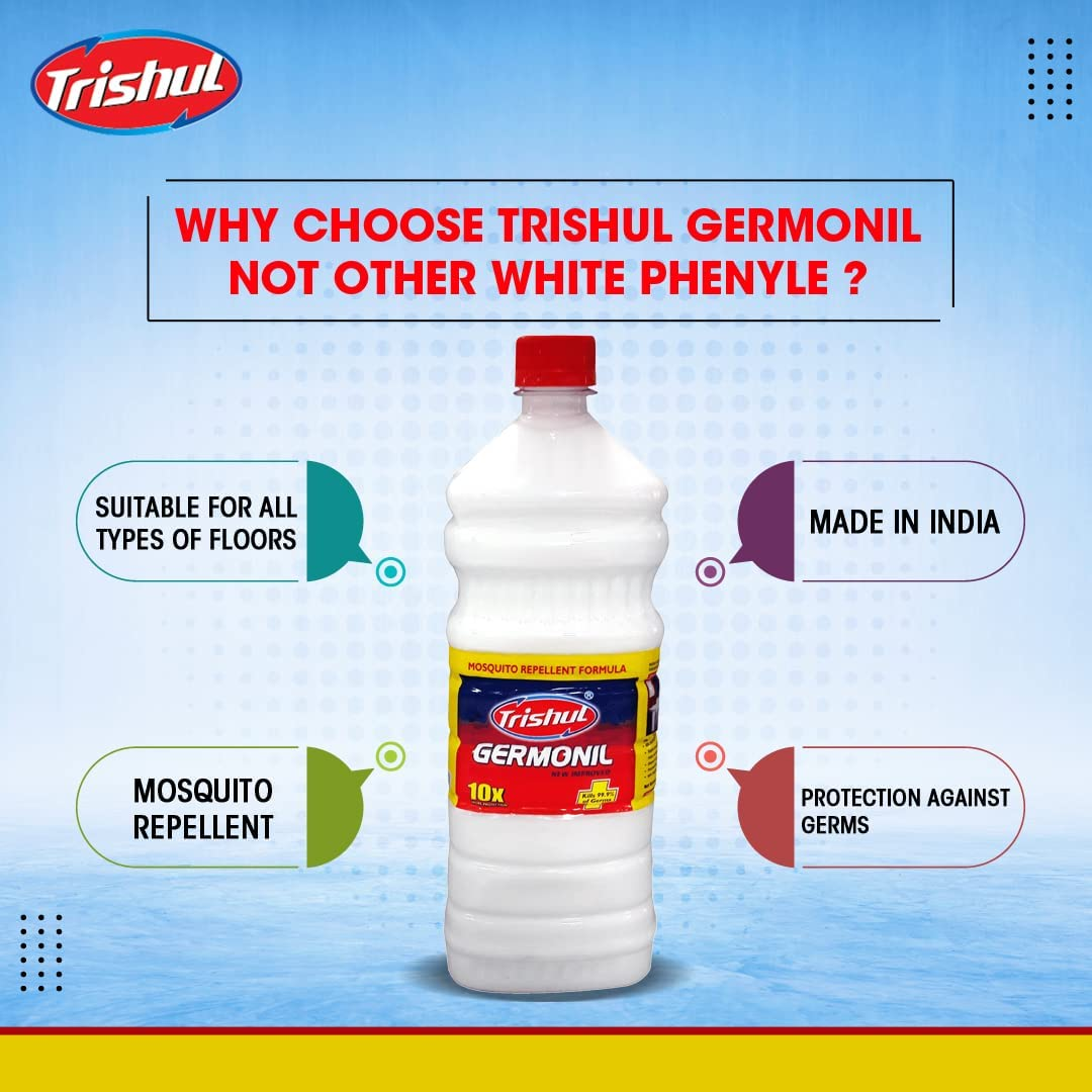 • PINE OIL BASED WHITE FLOOR CLEANER: Trishul Germonil White Floor Cleaner is prepared with pine oil and proves to be a super-efficient Cleaner & Disinfectant. It will help you to Keep your floor clean and free of germs. It is a homogeneous mixture of phenolic compounds, pine oil, and emulsifier resulting in white to off white shade.