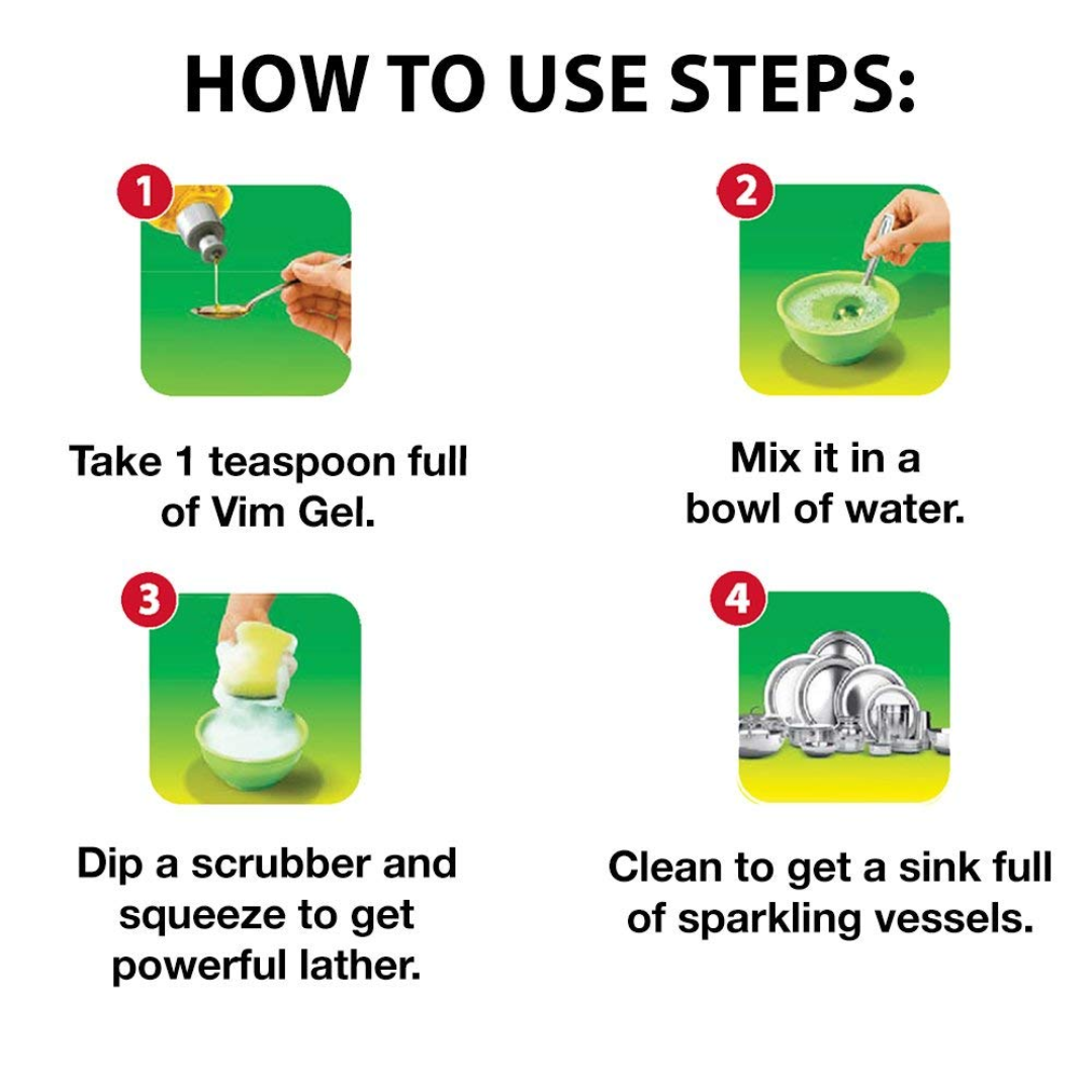 • One spoon of Vim Liquid Dishwash Gel is enough to clean one sink-full of dirty utensils.