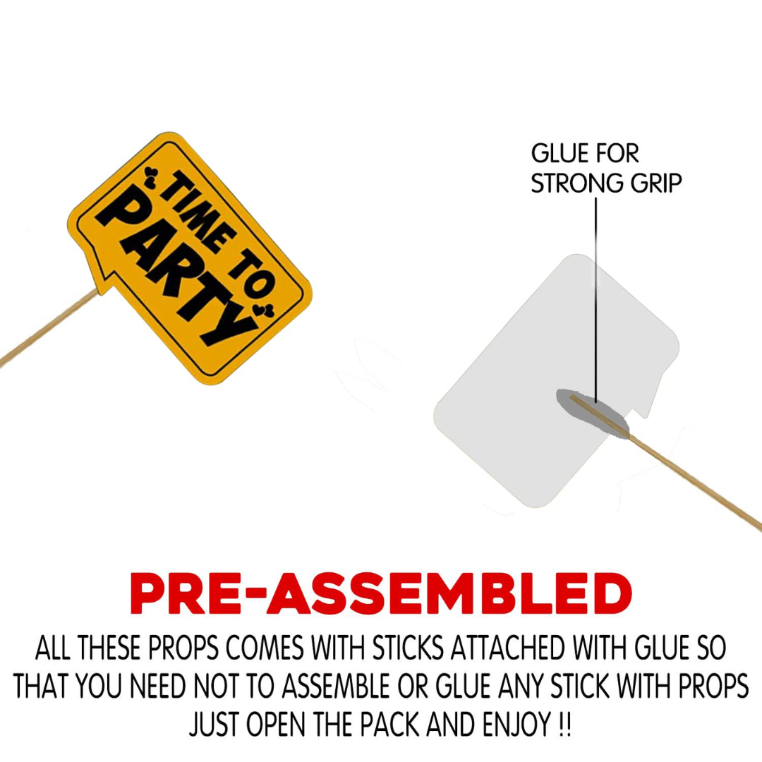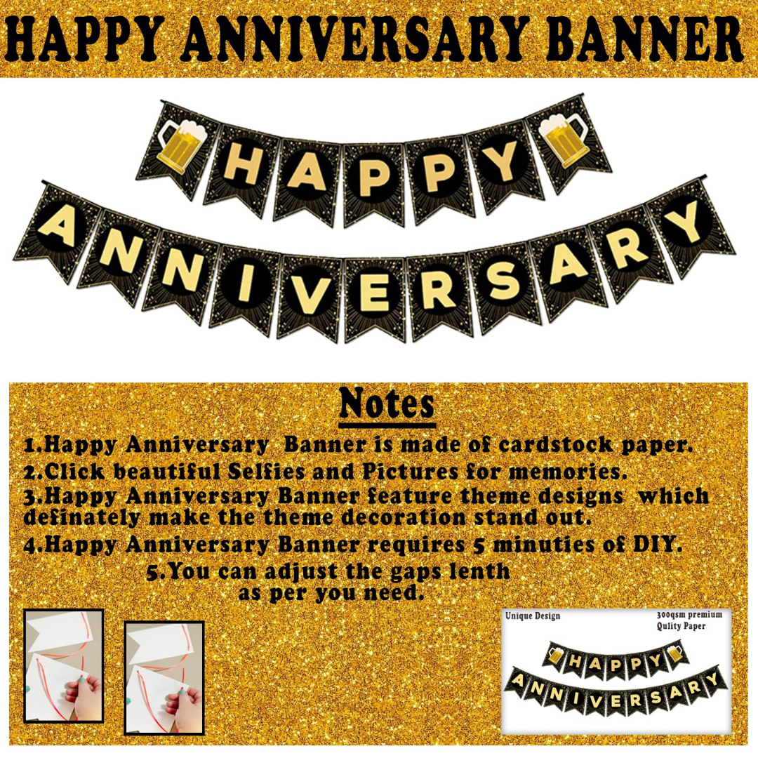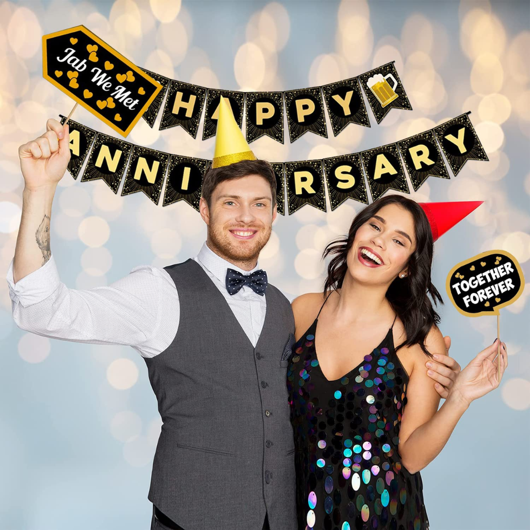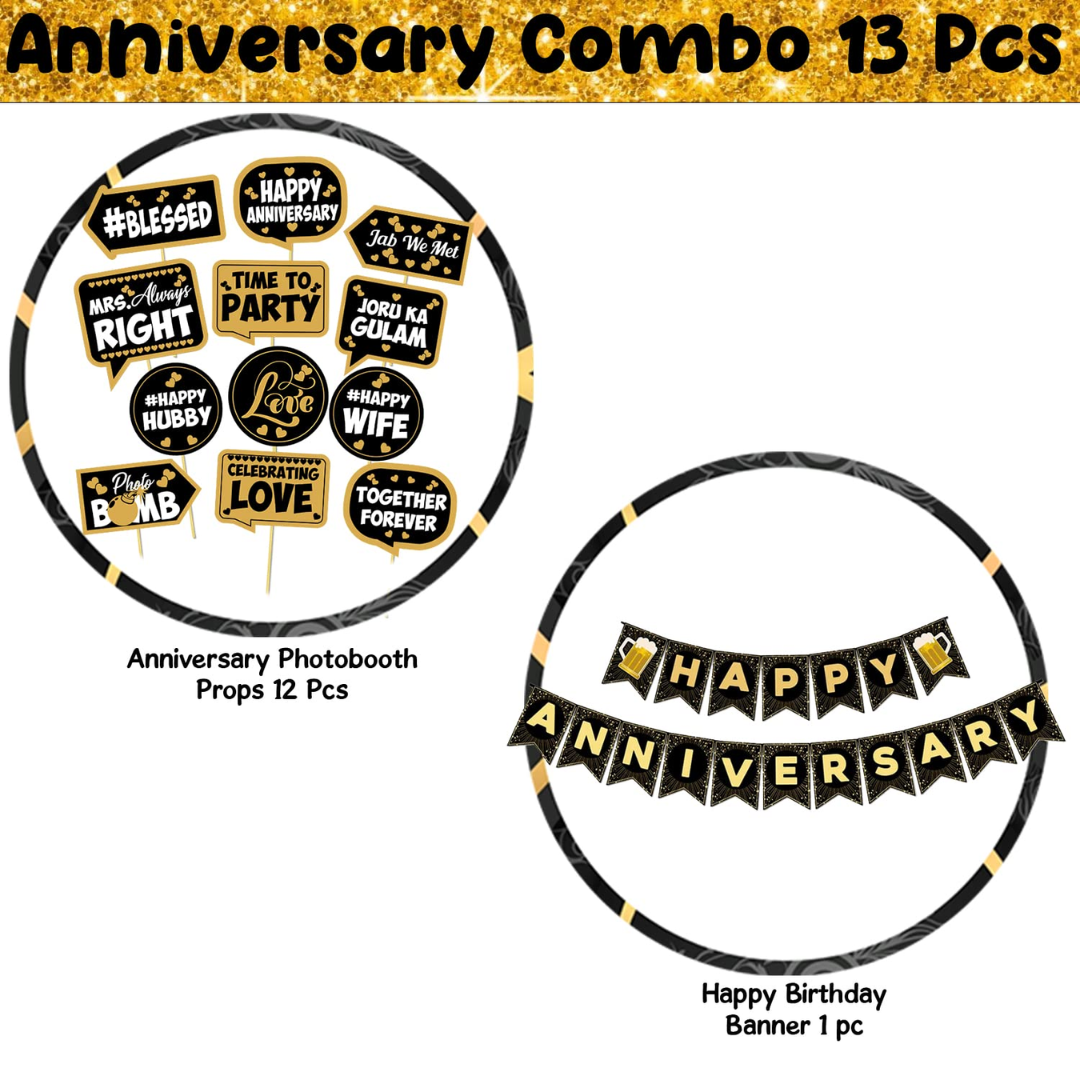 This happy aniversary combo set includes 1 Pc black and golden happy anniversary banner and 1 set of 12Pcs Photo booth props. Happy anniversary banner is made of cardstock and photobooth also is made of cardstock.