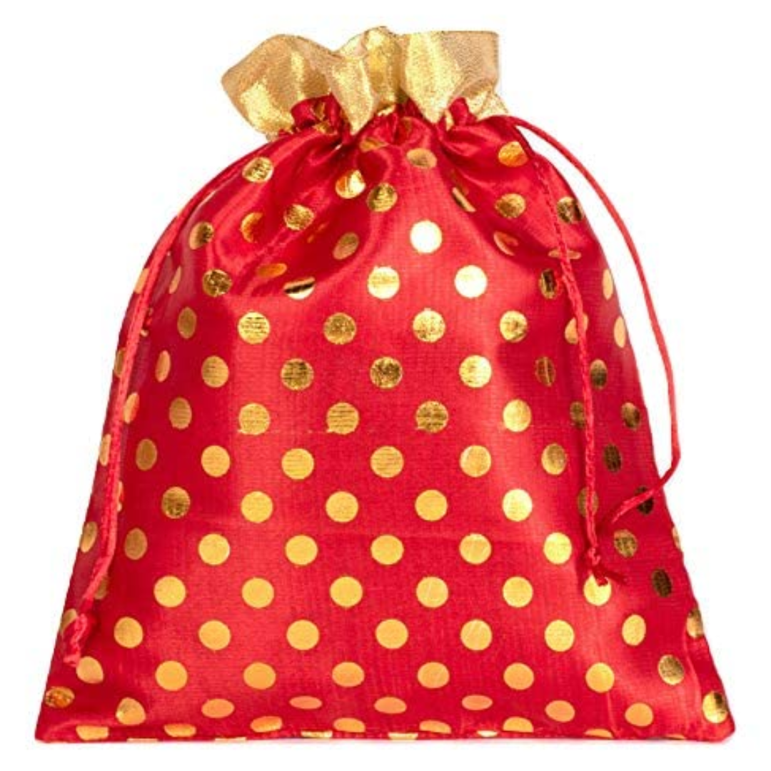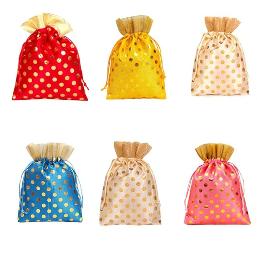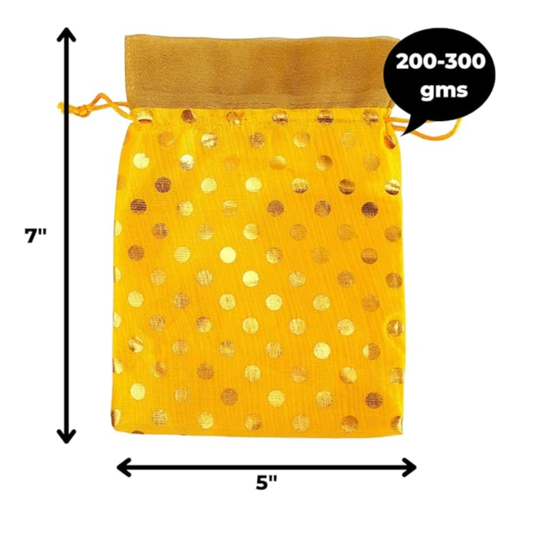 Thiese Potli bags meet the purpose of return gift on wedding, anniversay, birthday, baby shower and other occasions. it has capacity of 500 gms. this potli bags made from organza silk thread with drawstring clasp. These are Medium sized, elegant and trendy designer polka potli pouches suitable for keeping gift items and also for storing small items in order to avoid hassles searching for them. These pouches are designed using round golden dotted patterns which adds an exquisite and traditional look to this tiny beauty. Ease of accessibility – It can be closed and opened easily with minimum effort. Easily Portable – as it is small in size one can carry it without any trouble. Made in INDIA this trendy and stylish potli bags is ideal to put your valuables, accessories. This is a traditional and Potli bag which helps you carry things when at a wedding or party. The stunning Potli bag is perfect for everyday as well as for the party use. Its light in weight and has a great color. You can use this to distribute gifts to your friends, relatives and family members for Birthdays, Anniversary, Weddings or even as return gifts. These can also be used to store Dryfruit.