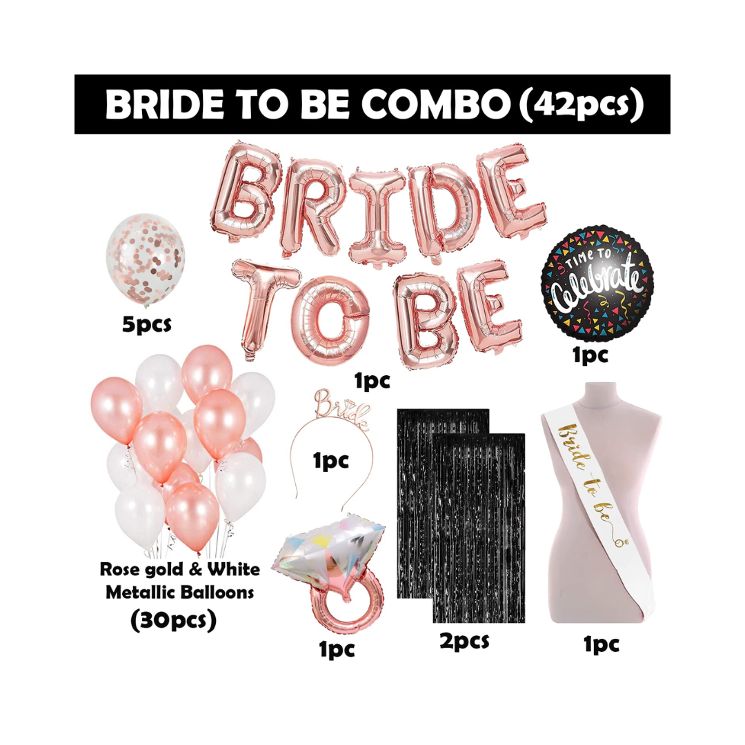 1pc bride to be rose gold foil balloon, 1pc time to celebrate printed round foil balloon, 30pcs rose gold & white metallic balloons, 5pcs rose gold confetti, 1pc ring foil balloon, 2pcs black foil curtains, 1pc bride hairband, 1pc bride to be sash