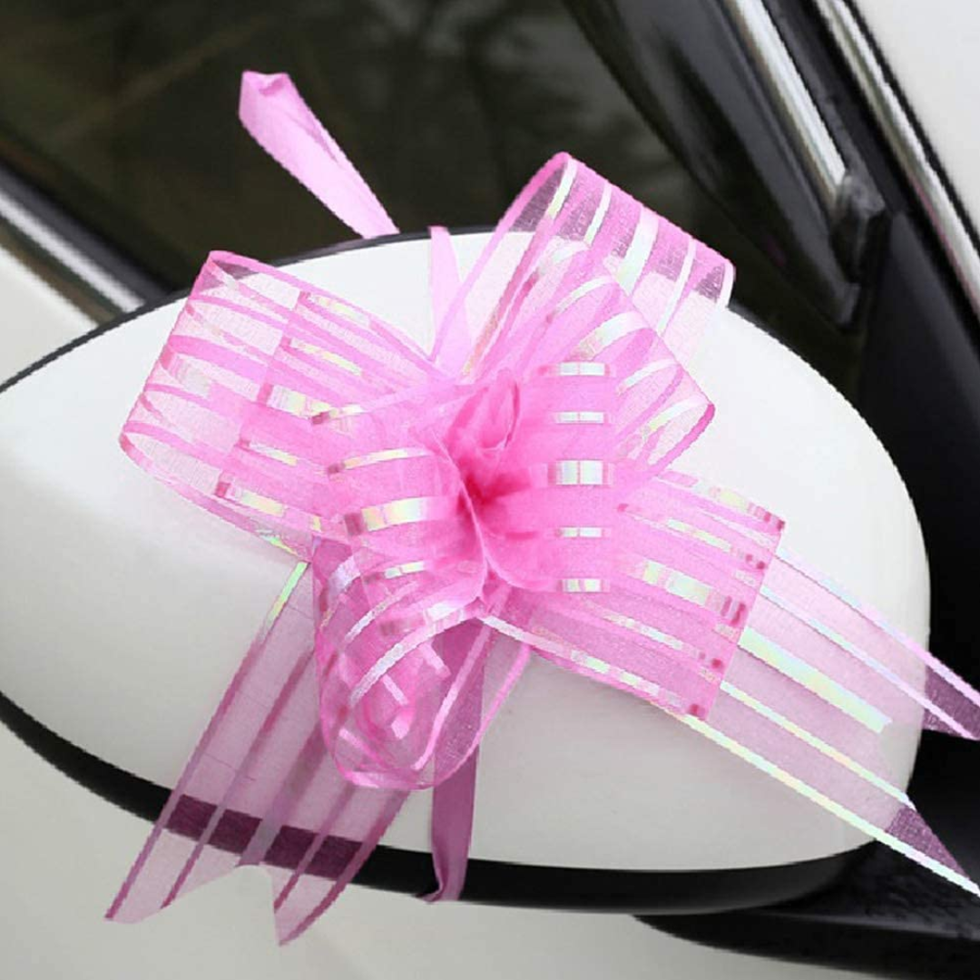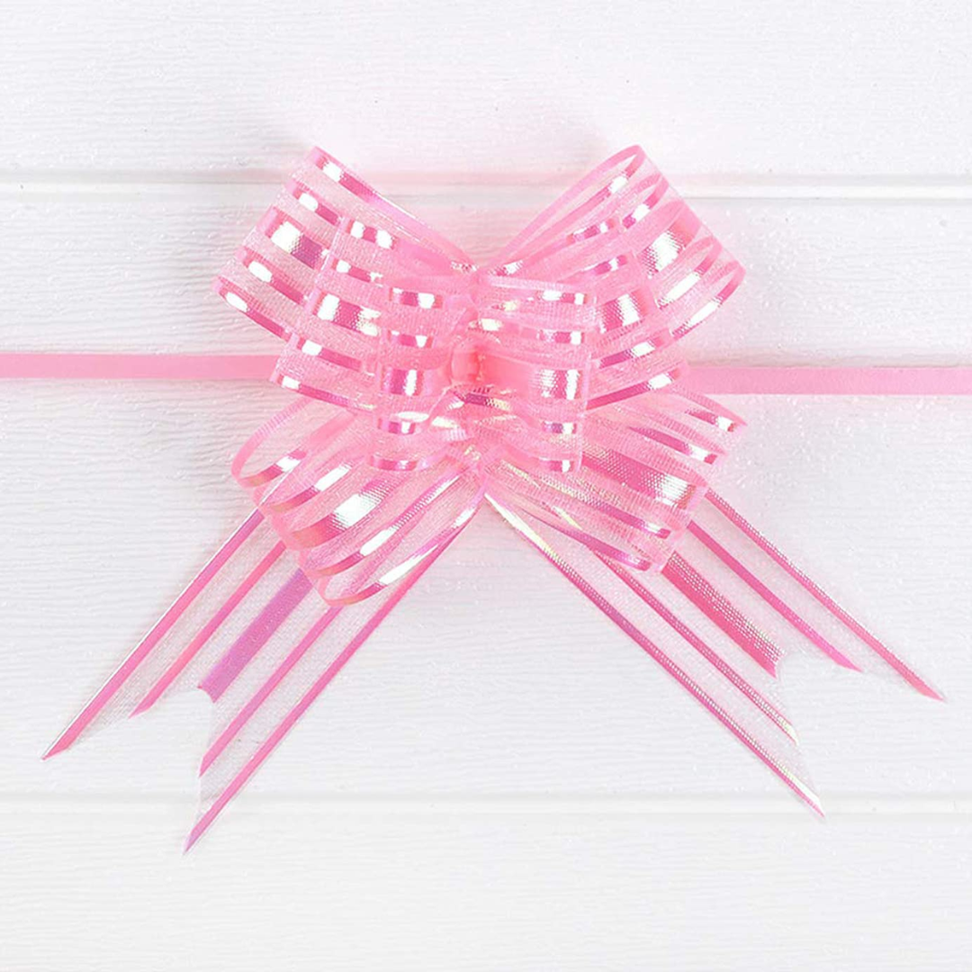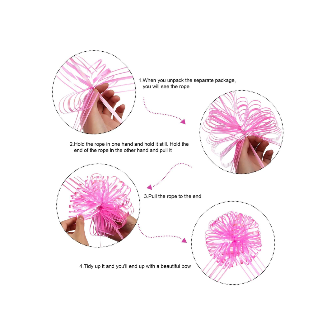 The finished bows are around 30mm wide ribbon bows Material: polyester Perfect to use for embellishment, gift wrapping, packaging, bows, and scrapbooking Use method :Hold one end, find and hold the two small inside ribbons from the other end and then pull them to make the flower. The two coming out small ribbons are used to tie around your gift bag or package and the beautiful flower should be on the top of your bag.