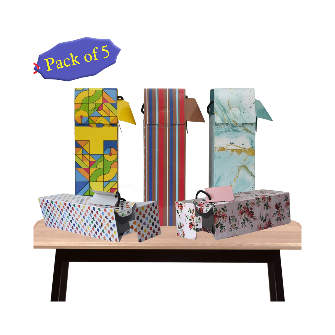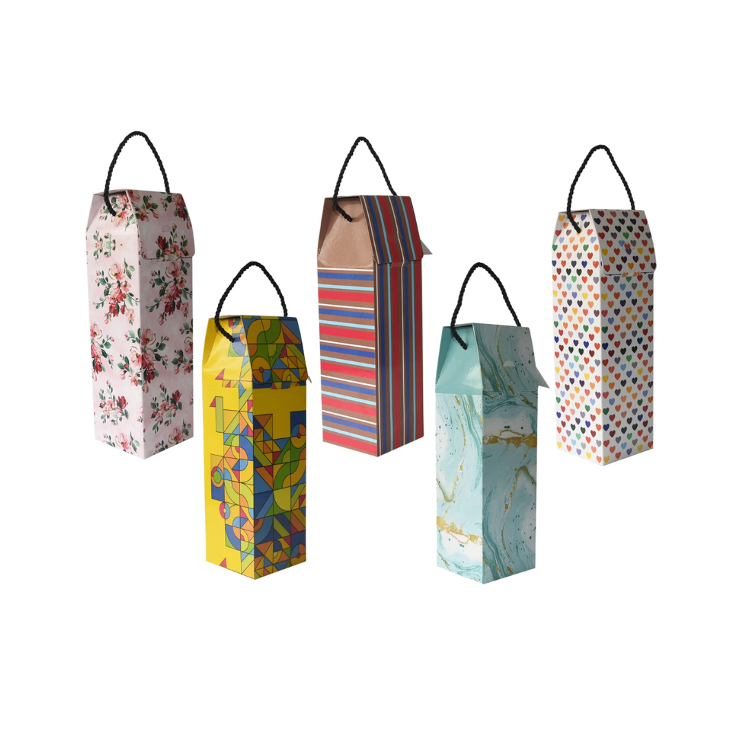 • Strong bag cum box made with high quality 400 GSM board. Sturdy handle and corrugated base included that helps to carry the heavy weight of any size and type of bottle